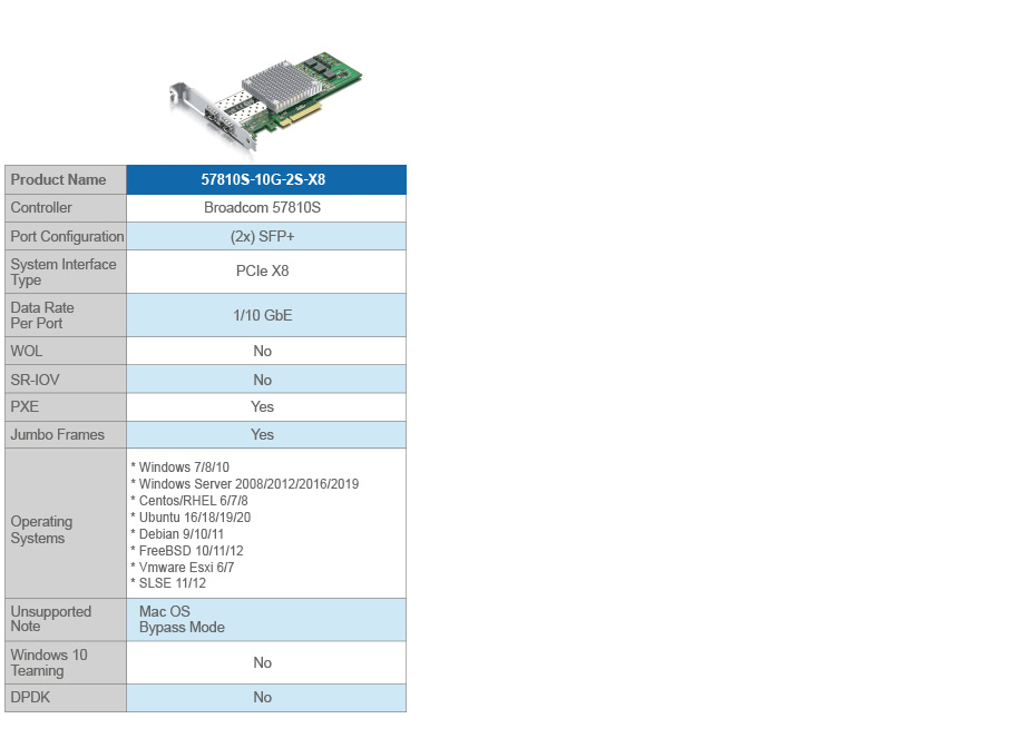 | 57810S-10G-2S-X8 | 10Gb/s | Broadcom 57810S | 2 x SFP+ | Broadcom BCM57810S | Download(Linux) Download(Windows) |